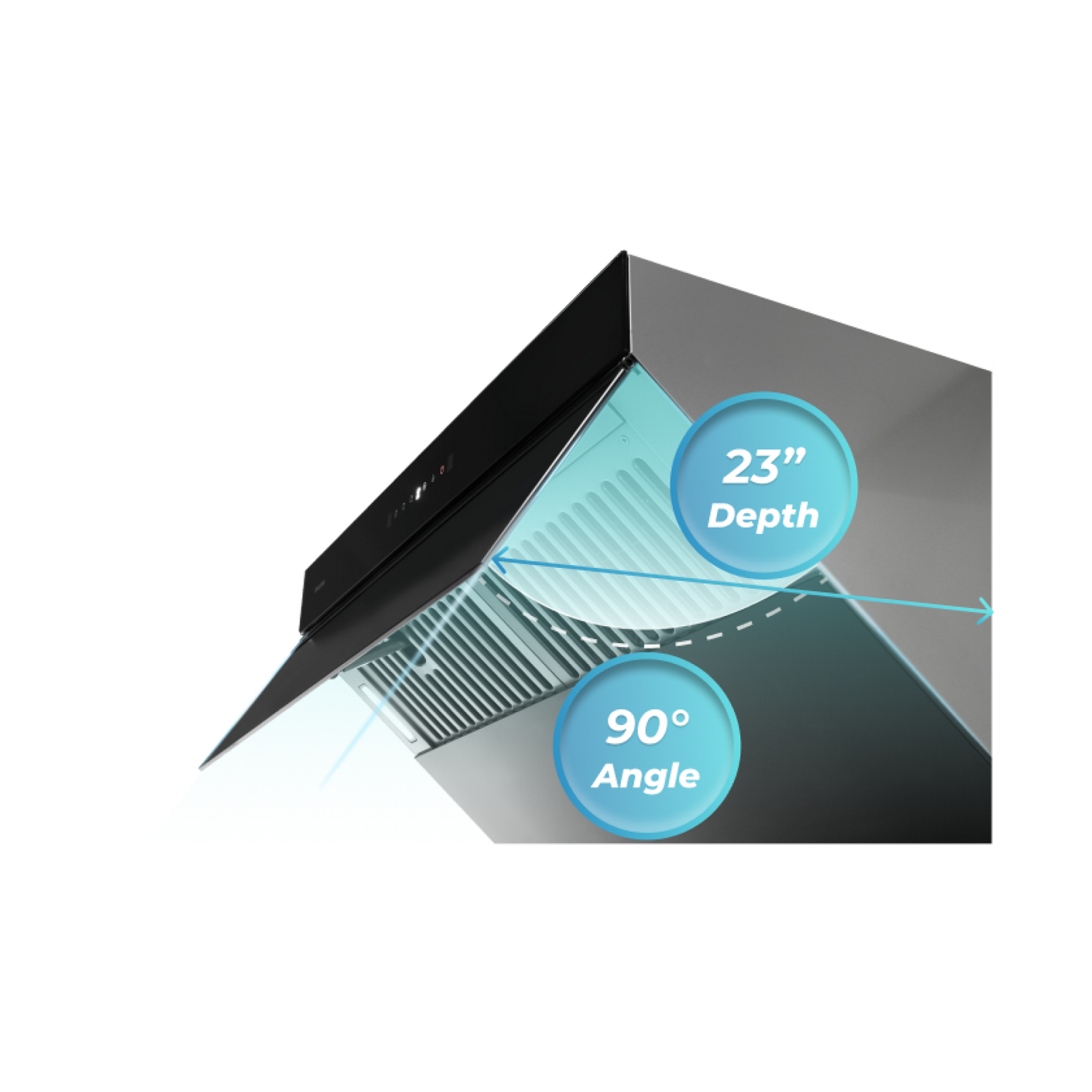 - Powerful suction with 23-inch depth large coverage area, complete fume exhausting is assured. 90 degree golden optimum angle prevents fumes from escaping, and creates efficient suction zone. Perfectly captures smoke from front and back burners.